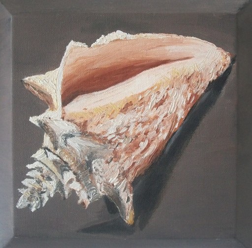 schelp De schilderijen met de schelpen zijn op doek geschilderd met schuin aflopende randen. bijzonder!